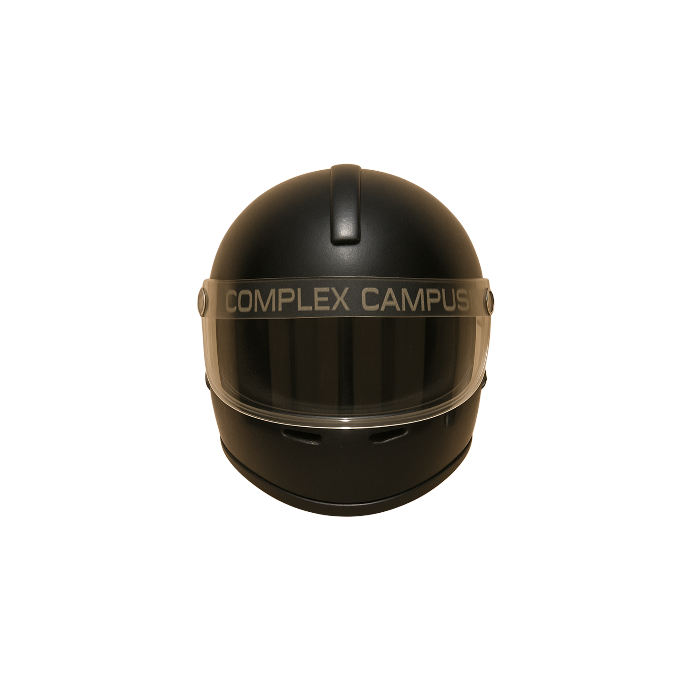 Featuring a white gloss shell with hand-painted red-orange flame streaks, a transparent racing visor embossed with COMPLEX CAMPUS, and a clay-textured finish that nods to FWCC’s miniature craftsmanship, each helmet represents precision, rebellion, and legacy. The aerodynamic silhouette mirrors Drive’s real-world circuits and his animated alter ego’s fearless pace.
