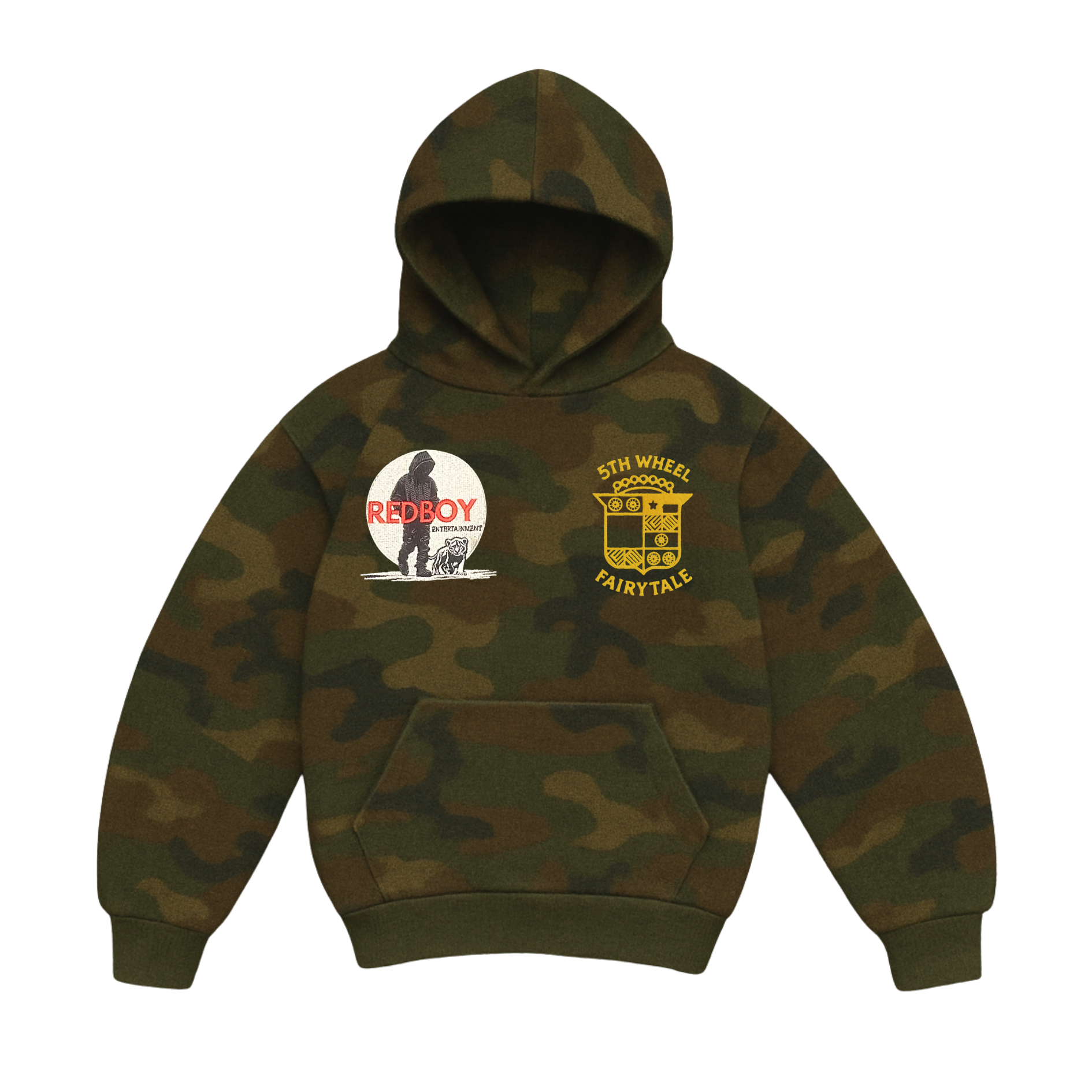 Straight out of Staten Island’s own Fifth Wheel Complex Campus, this limited-run camo hoodie is a collaboration between FWCC and Redboy Entertainment, the brainchild of neighborhood entrepreneur Calvin Yates II back in 1993. Known for his grind, vision, and a knack for turning local legends into household names, Calvin brought his signature Redboy silhouette to the FWCC stage—pairing hustle with heritage.