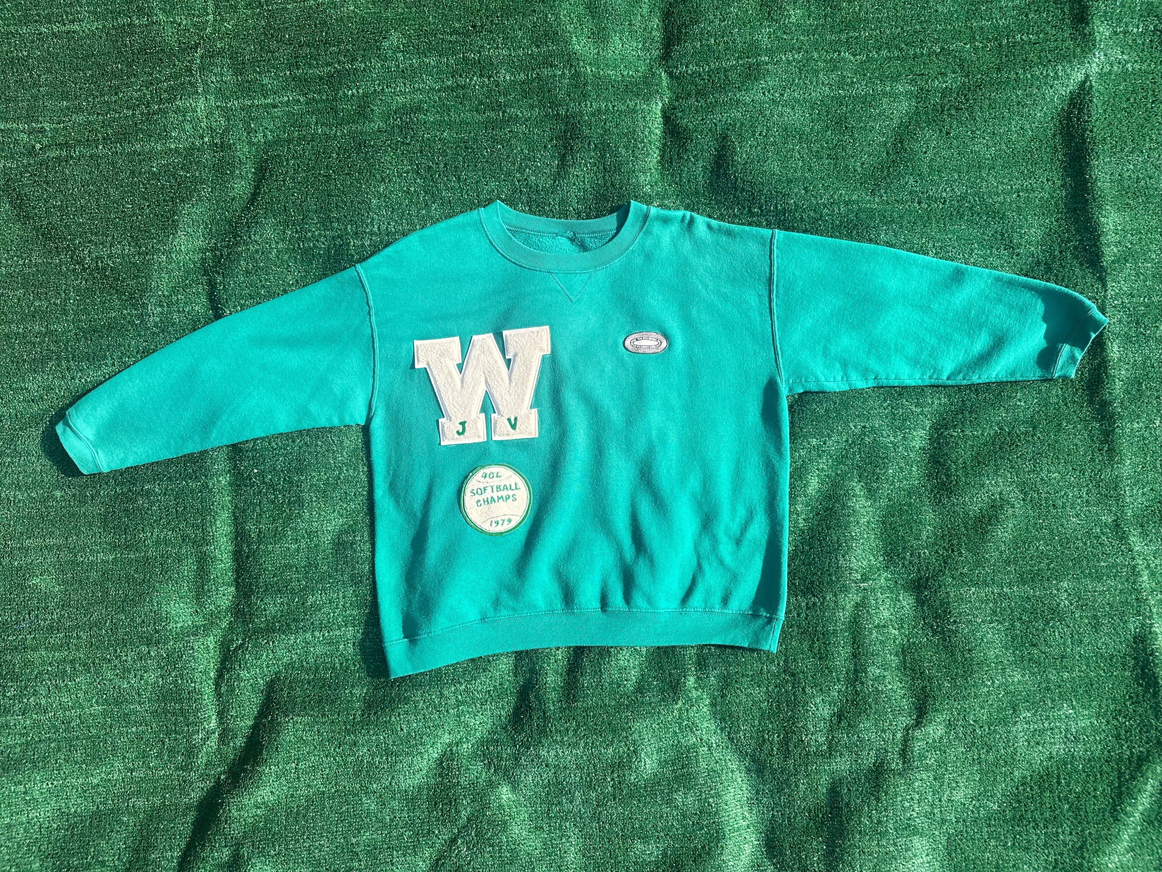 With its faded white lettering and battle-worn mint green fabric, this crewneck isn’t just vintage—it’s a trophy in its own right, a reminder of fictional champions who never looked back.
