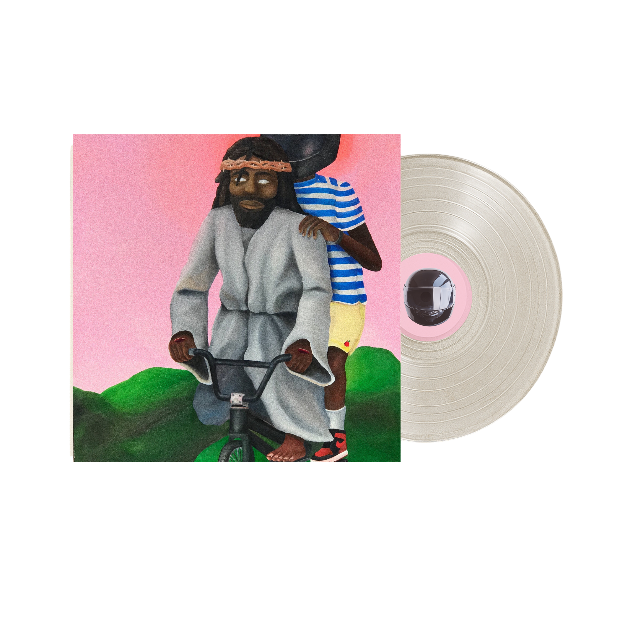 Creative Director Deezie Brown reimagines Judith as more than a soundtrack—it’s an illustrated parable pressed to wax. The vinyl sleeve carries the surreal image of a figure draped in robes, crown of thorns resting on his brow, guiding a BMX bike across rolling green hills beneath a pink horizon. Behind him, a youthful rider in striped jersey and shorts clings on, their sneakers flashing red and black like sparks against the grass. It’s not just an image—it’s Judith’s story refracted through allegory.
